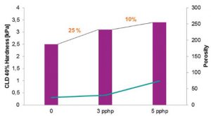 如圖1所示,在參考配方實(shí)驗(yàn)室條件下,密度為16kg/m3海綿中添加3pphp和5pphp 的nt h18,其硬度增加達(dá)到25%和35%。