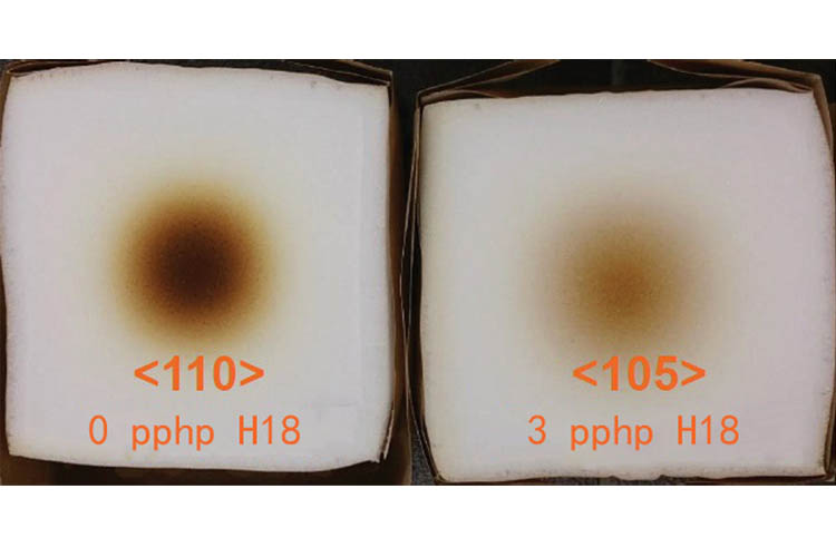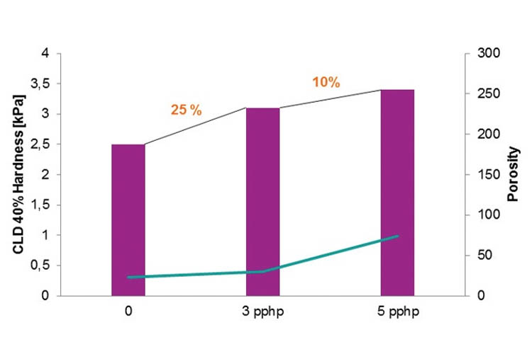 如圖1所示,在參考配方實驗室條件下,密度為16kg/m3海綿中添加3pphp和5pphp 的nt add h18,其硬度增加達到25%和35%。