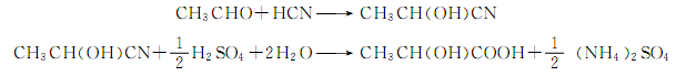 (1)乙醛法 以乙醛與氫氰酸為原料反應生成乳腈,經水解得粗乳酸,粗乳酸經乙醇酯化再水解得乳酸: