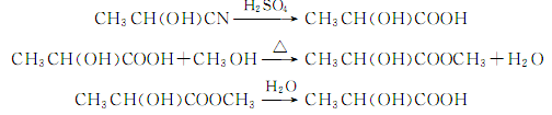 (2)丙烯腈法 丙烯腈水解得粗乳酸,再經甲醇酯化后水解得乳酸: